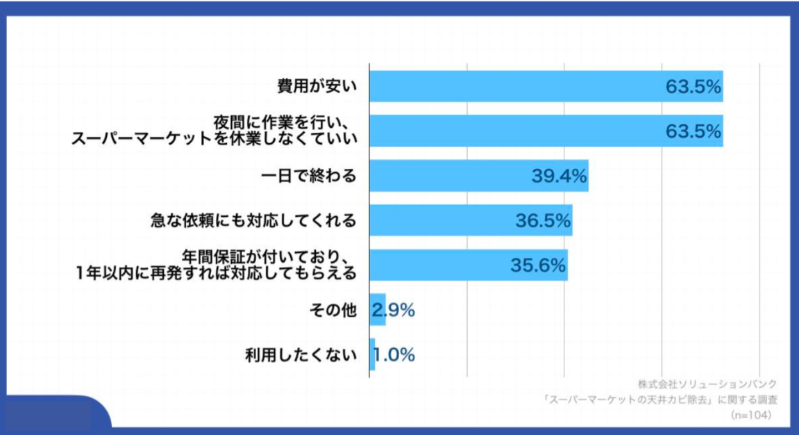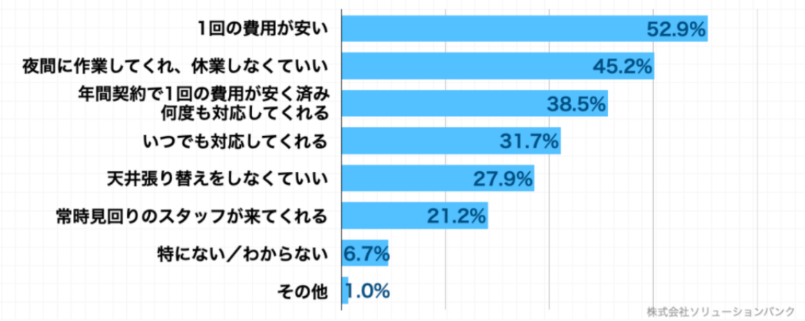 「1回の費用が安い」が52.9%、「夜間に作業してくれ、休業しなくていい」が45.2%、